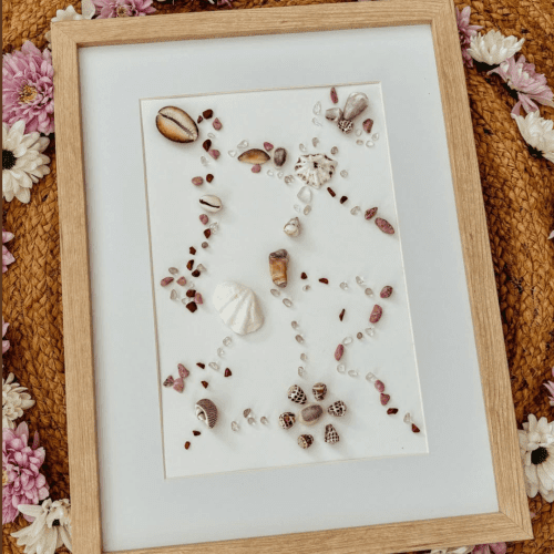Als de kristallen grid helemaal neergelegd is, plakken wij de stenen op en wordt de grid ingelijst zodat de mama het een speciaal plekje in huis kan geven.